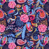 Color - Flowering Garden. Paisley florals and leaves unfurl in pink, sax blue and orange across a dark blue ground.